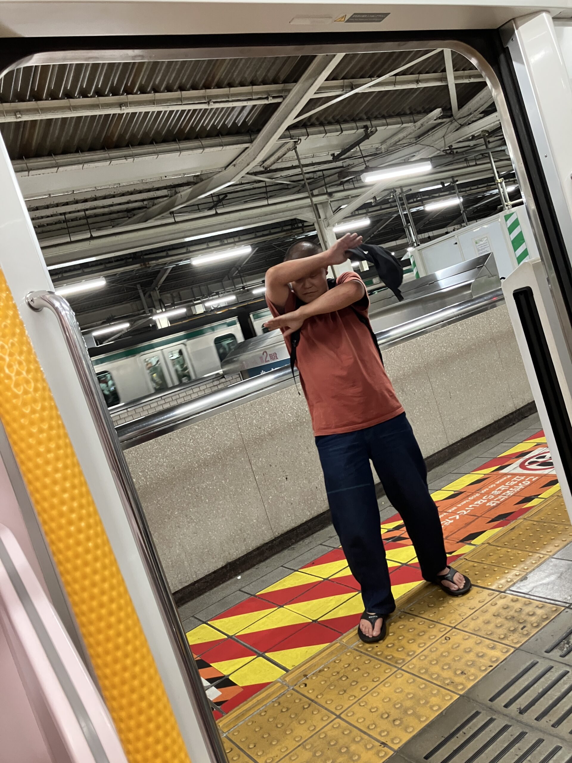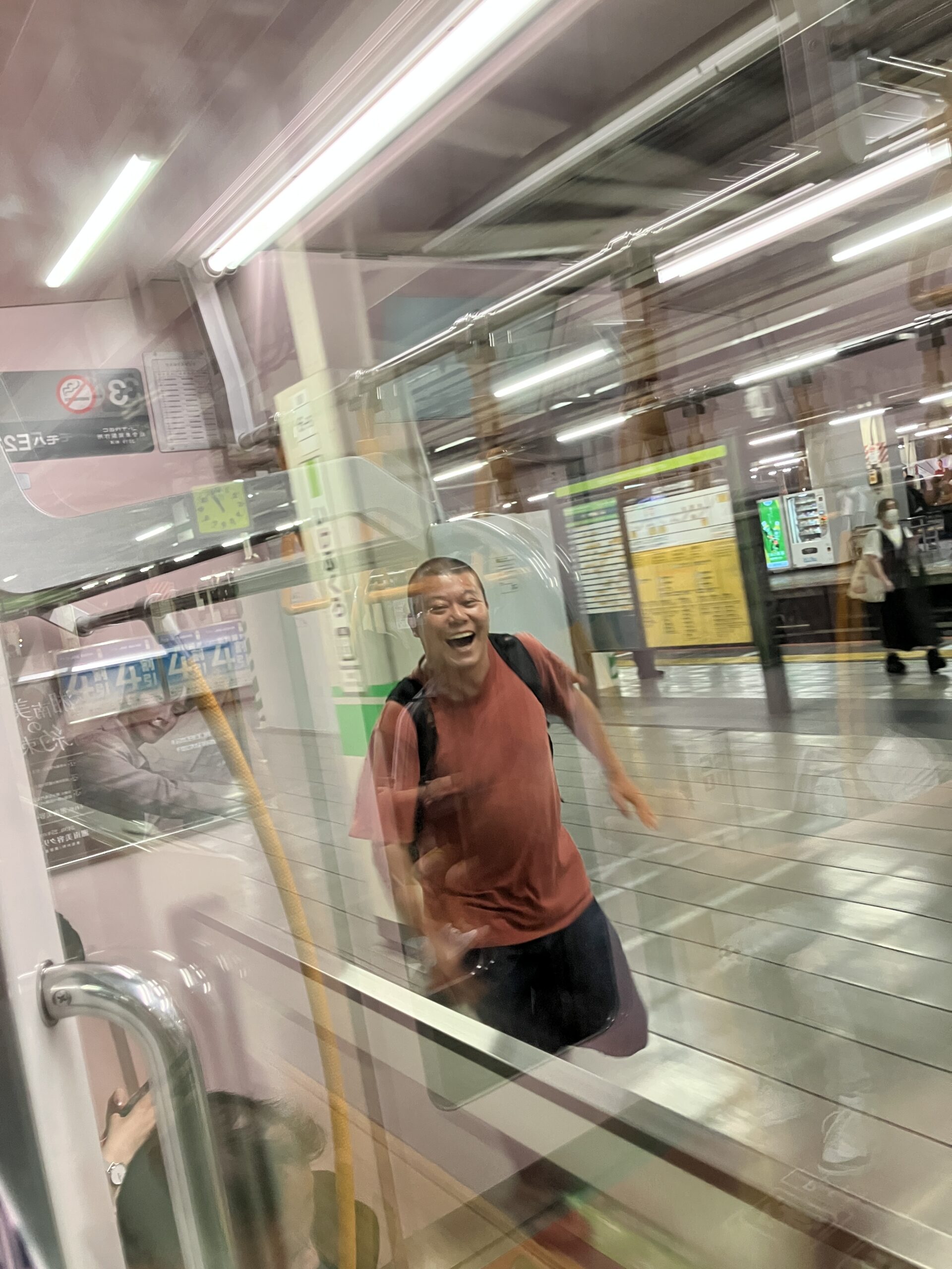 写真上:打ち合わせ後の去り際に駅のホームでポーズをキメる阪本勇君。