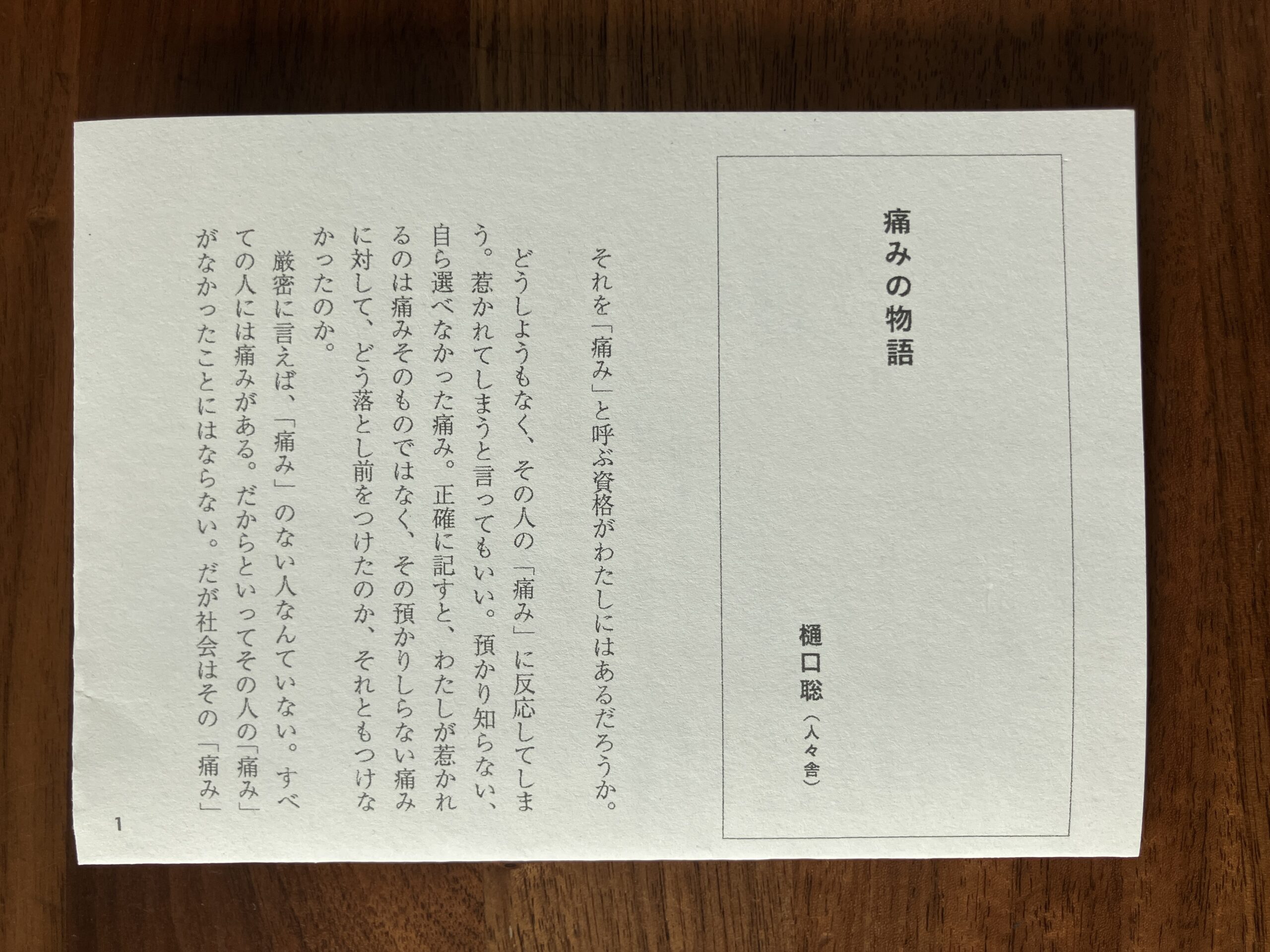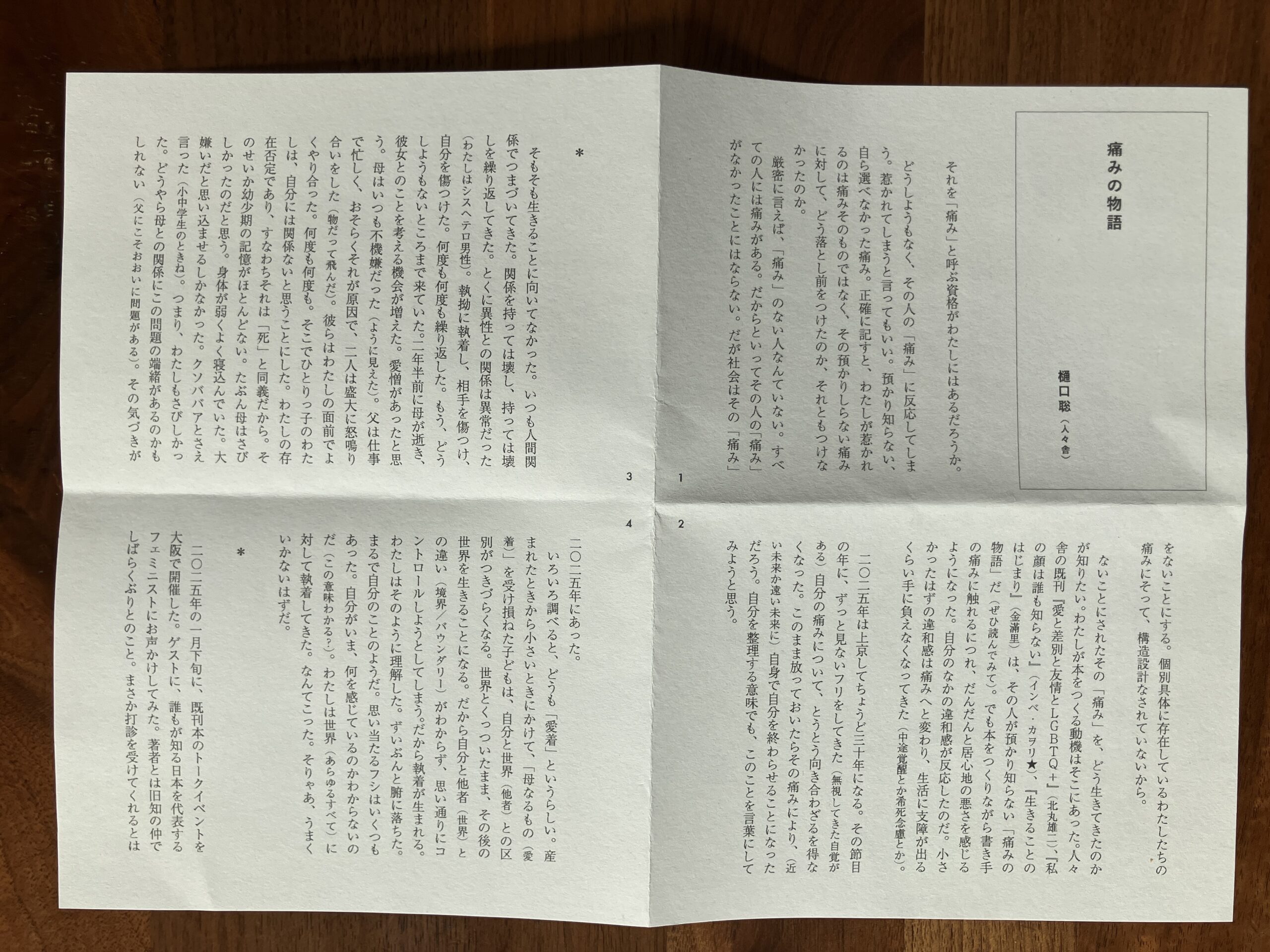 明日11月23日(日)の文学フリマ東京41に初出店します。東京ビッグサイトの南3・4ホールのさ-43ブースです。既刊本は10%OFFにします。新刊として『痛みの物語』というA4二つ折り8PのZINEをつくりました。モンテシオンというA4紙両面にインクジェットでプリントしました。広げるとA4用紙1枚になります。2025年は大きな気づきがありました。家族のこと、死んだ母のこと、自分の気づき、そして本づくりのことを、3000字程度でエッセイにしました。100円です。